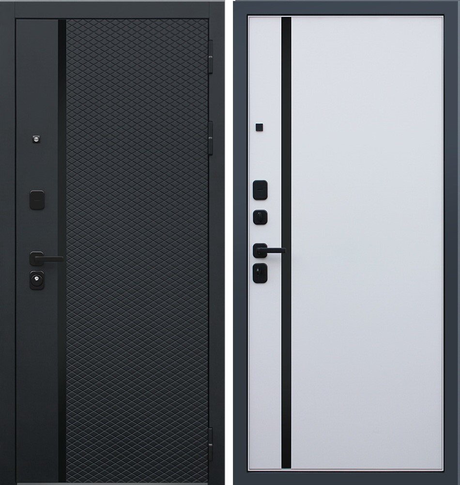 Порошковое покрытие "муар черный". Экошпонированная панель МДФ 10 мм (дизайн ФЛС). Цвет "черный кварц". Вертикальная вставка из черного глянцевого лакобеля. Объемная фрезеровка. Наличник МДФ гладкий, 80 мм.